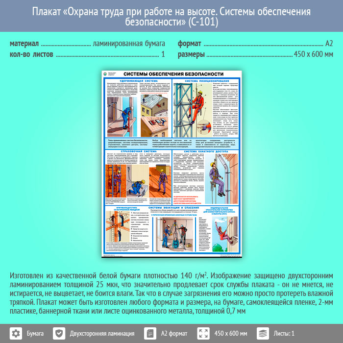 Плакат «Охрана труда при работе на высоте. Системы обеспечения безопасности» (С-101, ламинированная бумага, А2, 1 лист) в Пушкино купить
