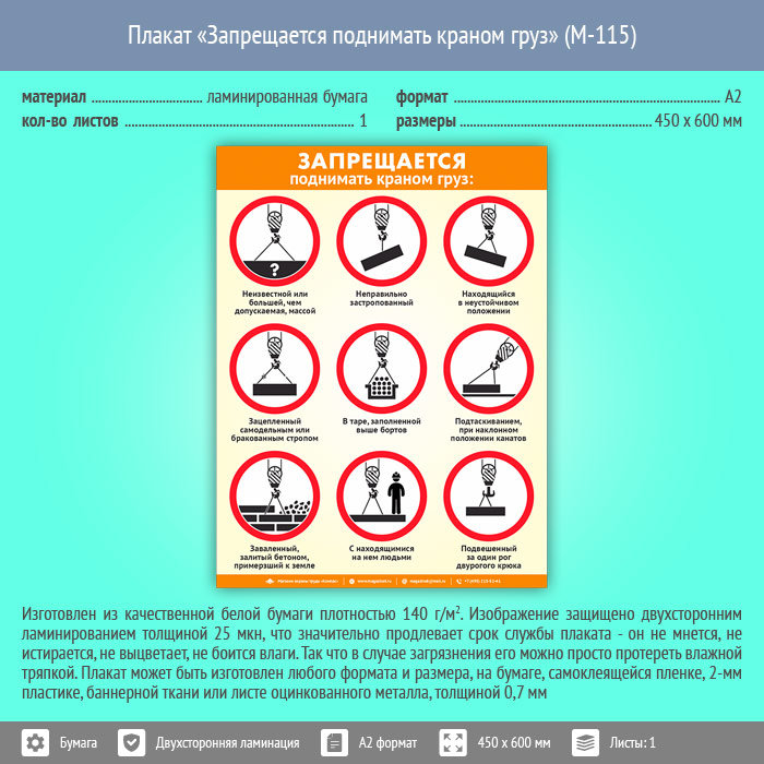 Плакат «Запрещается поднимать краном груз» (М-115, ламинированная бумага, А2, 1 лист) в Пушкино купить