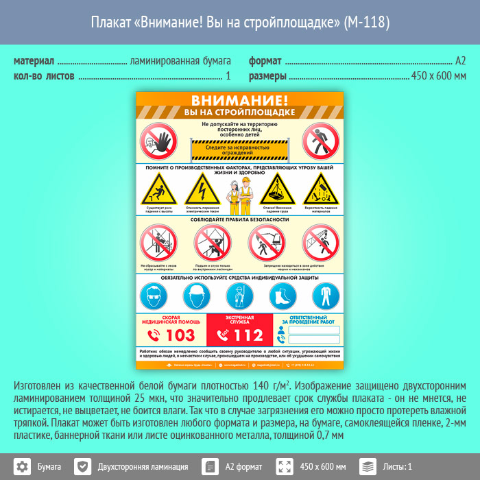 Плакат «Внимание! Вы на стройплощадке» (М-118, ламинированная бумага, А2, 1 лист) в Пушкино купить