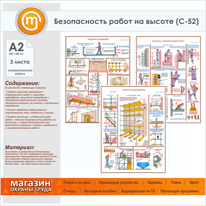 Плакаты «Безопасность работ на высоте» (С-52, ламинированная бумага, А2, 3 листа) в Пушкино купить