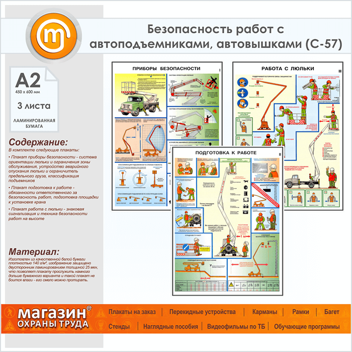 Плакаты «Безопасность работ с автоподъемниками, автовышками» (С-57, ламинированная бумага, А2, 3 листа) в Пушкино купить