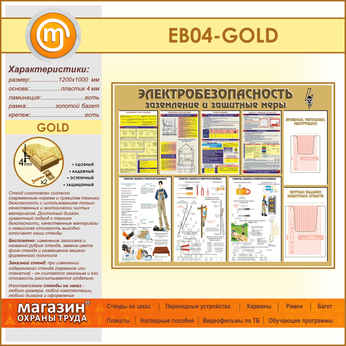Стенд «Электробезопасность. Заземление и защитные меры» с 2 объемными карманами (EB-04-GOLD) в Пушкино купить