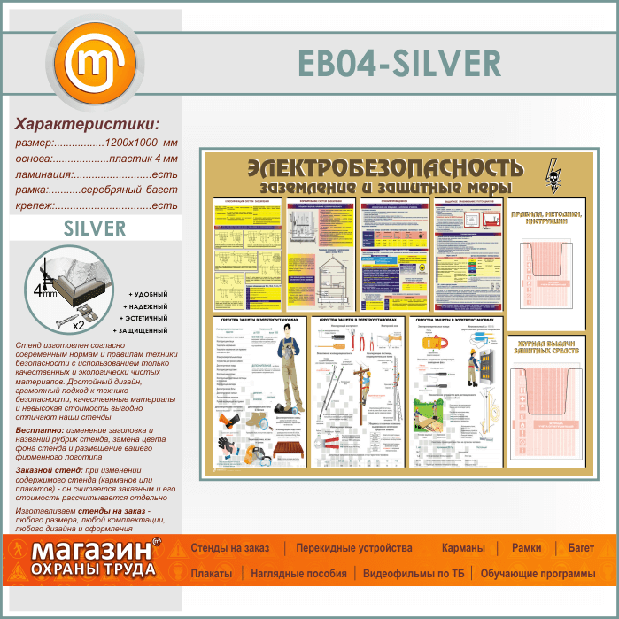 Стенд «Электробезопасность. Заземление и защитные меры» с 2 объемными карманами (EB-04-SILVER) в Пушкино купить