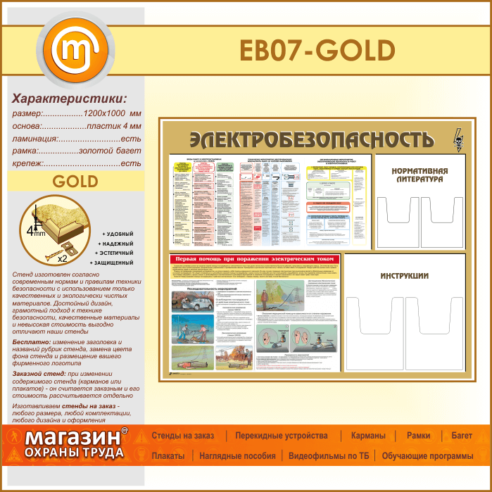 Стенд «Электробезопасность» с 4 объемными карманами (EB-07-GOLD) в Пушкино купить