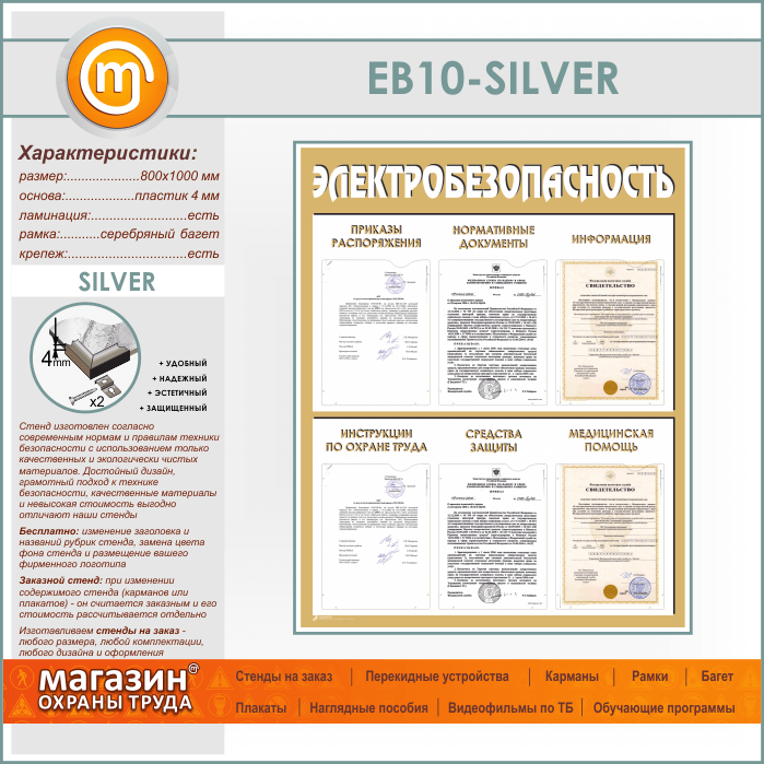Стенд «Электробезопасность» с 6 карманами (EB-10-SILVER) в Пушкино купить