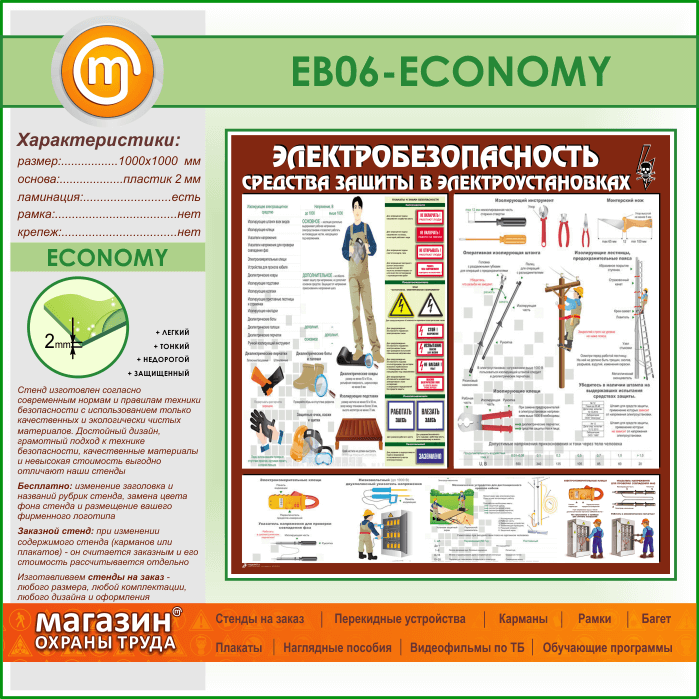 Стенд «Электробезопасность. Средства защиты в электроустановках» (EB-06-ECONOMY) в Пушкино купить