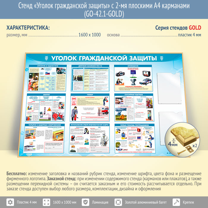 Стенд «Уголок гражданской защиты» с 2-мя плоскими А4 карманами (GO-42.1-GOLD) в Пушкино купить