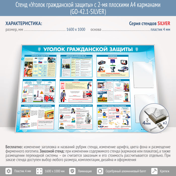 Стенд «Уголок гражданской защиты» с 2-мя плоскими А4 карманами (GO-42.1-SILVER) в Пушкино купить