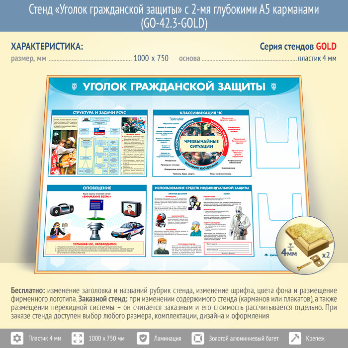 Стенд «Уголок гражданской защиты» с 2-мя глубокими А5 карманами (GO-42.3-GOLD) в Пушкино купить