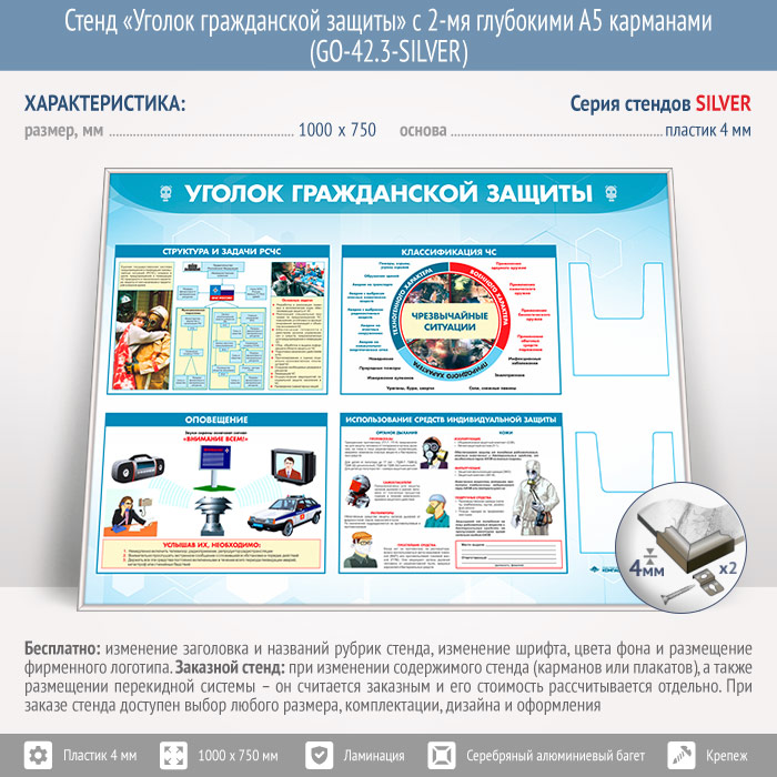 Стенд «Уголок гражданской защиты» с 2-мя глубокими А5 карманами (GO-42.3-SILVER) в Пушкино купить