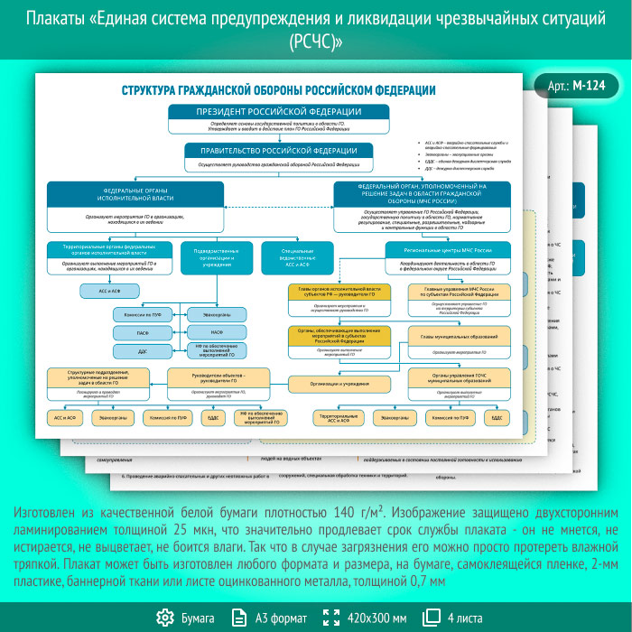 Плакаты «Единая система предупреждения и ликвидации чрезвычайных ситуаций (РСЧС)» (М-124, ламинированная бумага, А3, 4 листа) в Пушкино купить