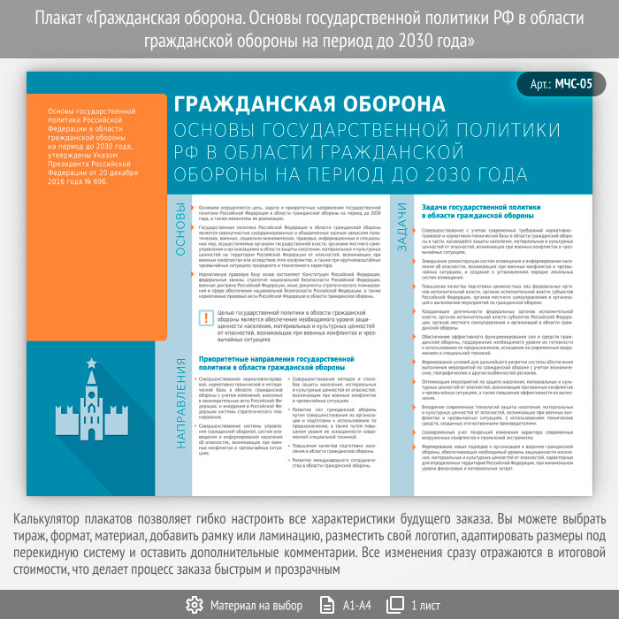 Плакат «Гражданская оборона. Основы государственной политики РФ в области гражданской обороны на период до 2030 года» (МЧС-05, 1 лист) в Пушкино купить