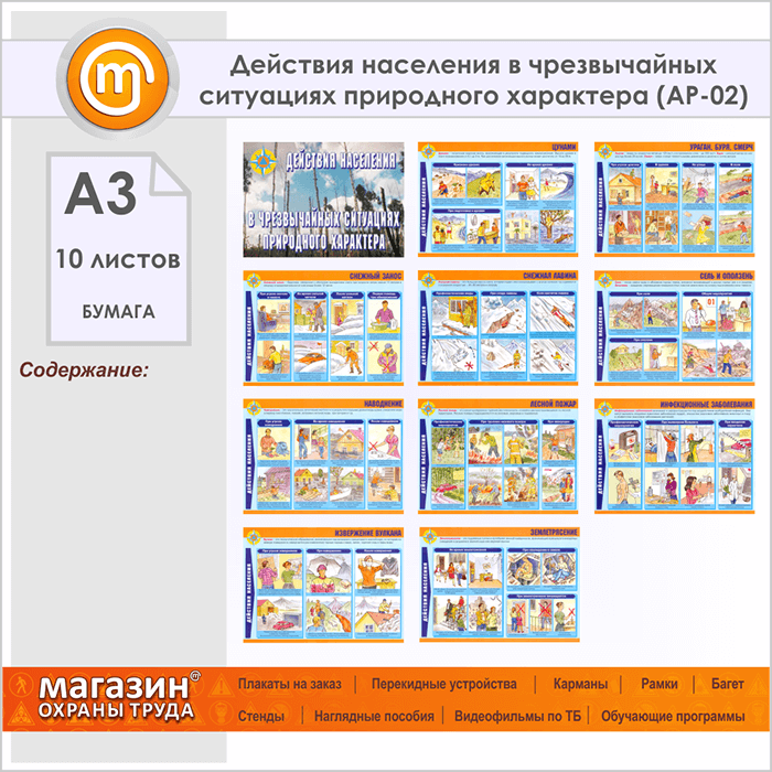 Плакаты «Действия населения в чрезвычайных ситуациях природного характера» (АР-02, бумага, А3, 10 листов) в Пушкино купить