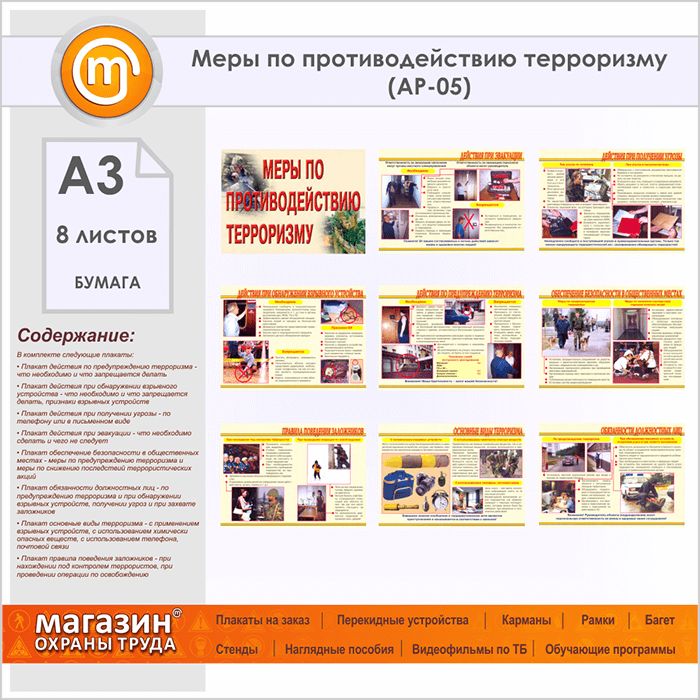 Плакаты «Меры по противодействию терроризму» (АР-05, бумага, А3, 8 листов) в Пушкино купить