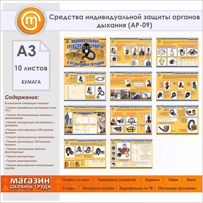 Плакаты «Средства индивидуальной защиты органов дыхания» (АР-09, бумага, А3, 10 листов) в Пушкино купить