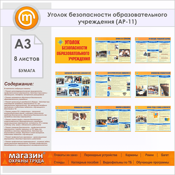Плакаты «Уголок безопасности образовательного учреждения» (АР-11, бумага, А3, 8 листов) в Пушкино купить