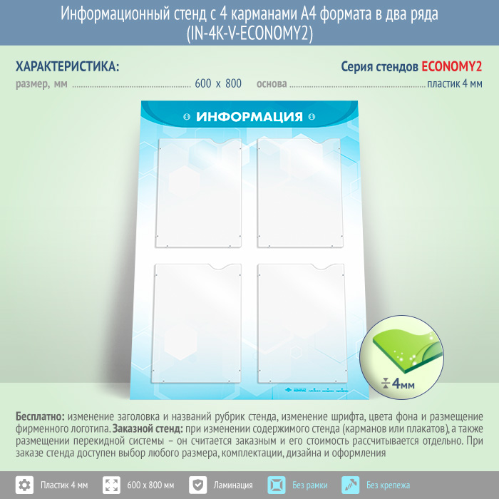 Информационный стенд с 4 карманами А4 формата в два ряда (IN-4K-V-ECONOMY2) в Пушкино купить
