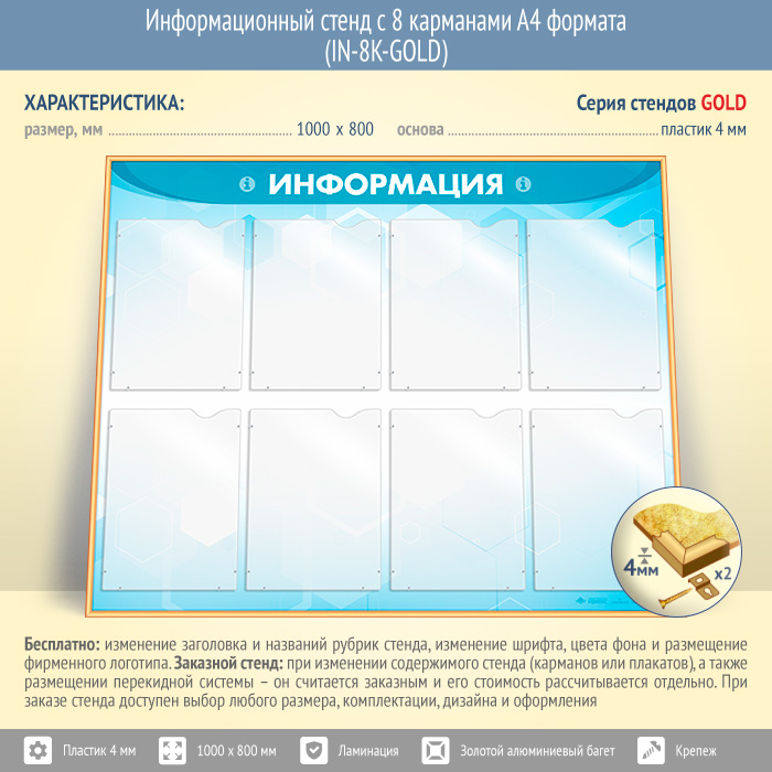 Информационный стенд с 8 карманами А4 формата (IN-8K-GOLD) в Пушкино купить