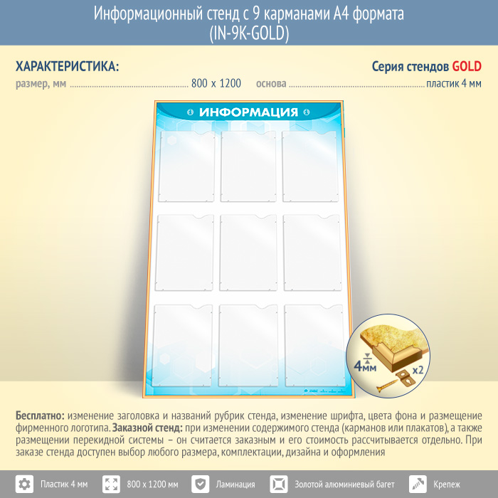 Информационный стенд с 9 карманами А4 формата (IN-9K-GOLD) в Пушкино купить