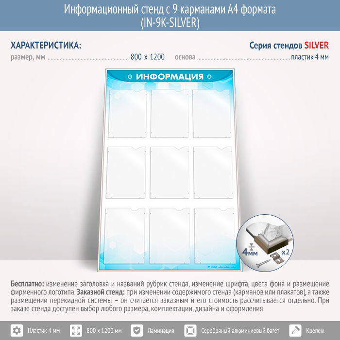 Информационный стенд с 9 карманами А4 формата (IN-9K-SILVER) в Пушкино купить