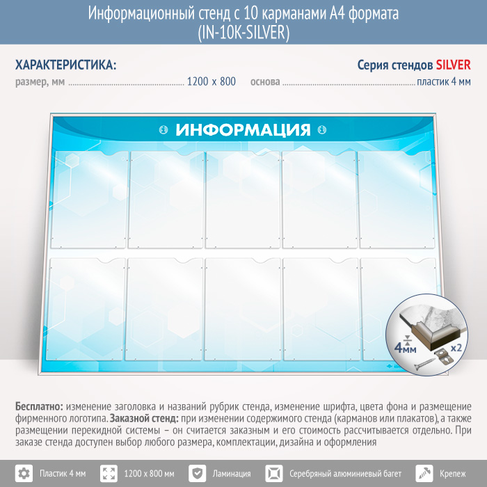 Информационный стенд с 10 карманами А4 формата (IN-10K-SILVER) в Пушкино купить