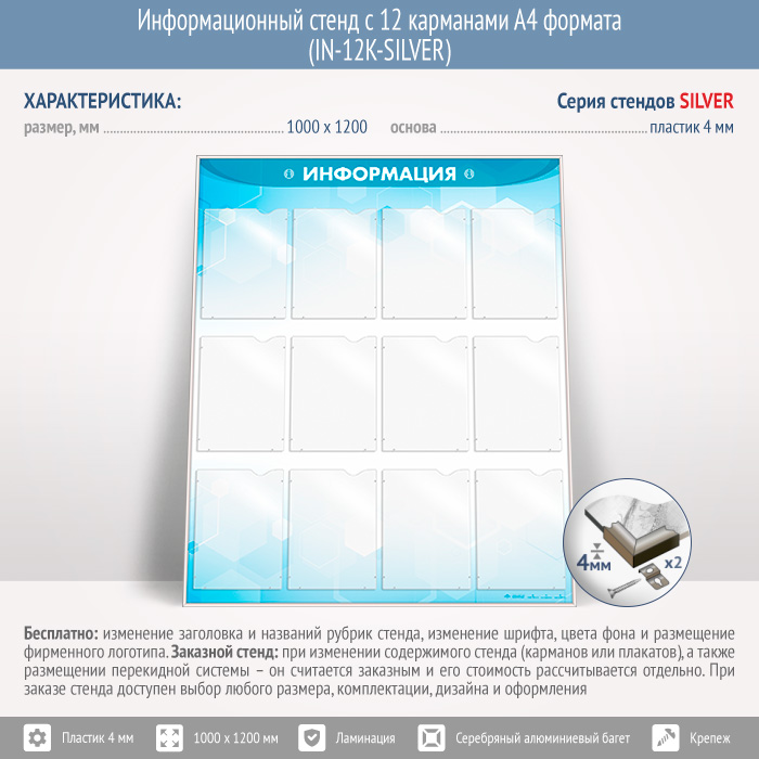 Информационный стенд с 12 карманами А4 формата (IN-12K-SILVER) в Пушкино купить