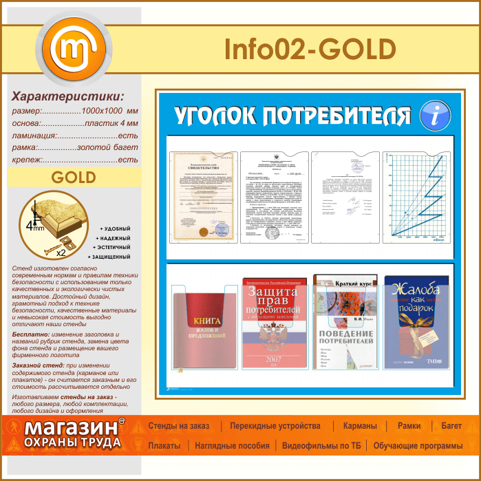 Стенд «Уголок потребителя» с 4 плоскими и 4 объемными карманами А4 формата (IN-02-GOLD) в Пушкино купить