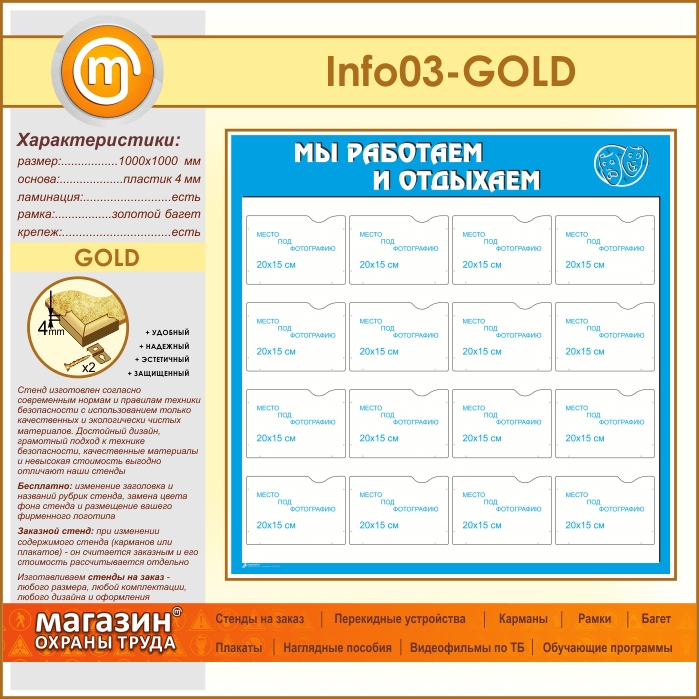 Стенд «Мы работаем и отдыхаем» с 16 карманами А5 формата (IN-03-GOLD) в Пушкино купить