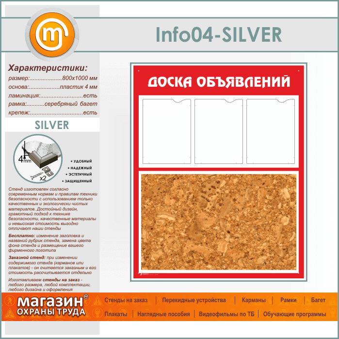 Стенд «Доска объявлений» с пробковым полотном и 3 карманами А4 формата (IN-04-SILVER) в Пушкино купить