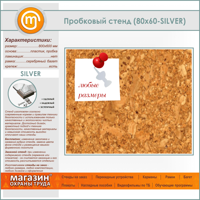 Пробковая доска, 80х60 см (IN-05-SILVER) в Пушкино купить
