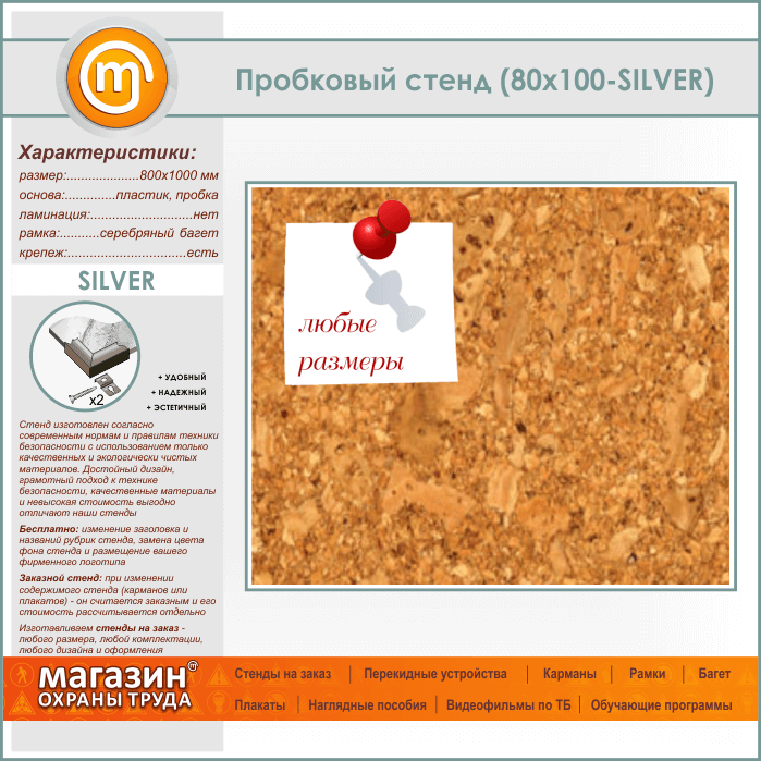 Пробковая доска, 100х80 см (IN-05-SILVER) в Пушкино купить