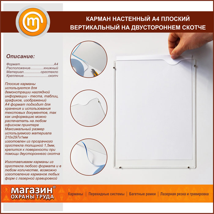 Карман настенный А4 плоский вертикальный на двустороннем скотче в Пушкино купить