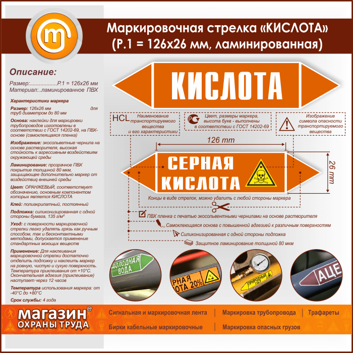 Маркировочная стрелка «КИСЛОТА» (Р.1 = 126х26 мм, самоклеящаяся плёнка с ламинированием) в Пушкино купить