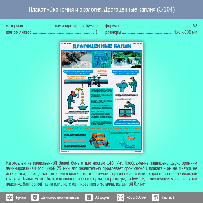 Плакат «Экономия и экология. Драгоценные капли» (С-104, ламинированная бумага, А2, 1 лист) в Пушкино купить