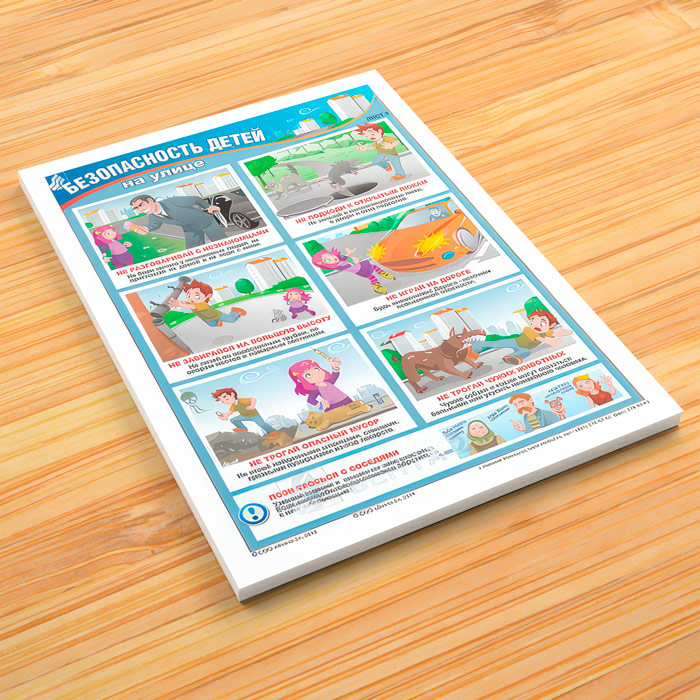 В плакате «Безопасность детей на улице» с помощью тематических авторских рисунков в доступной для детей форме описываются различные опасные и потенциально опасные ситуации, в которых могут оказаться дети. Плакат предостерегает детей о том, что нельзя открывать двери незнакомым людям, пользоваться спичками и зажигалками, самостоятельно включать электроприборы и газовую плиту и о других опасных действиях, которые ребенок может сделать, находясь без присмотра взрослого