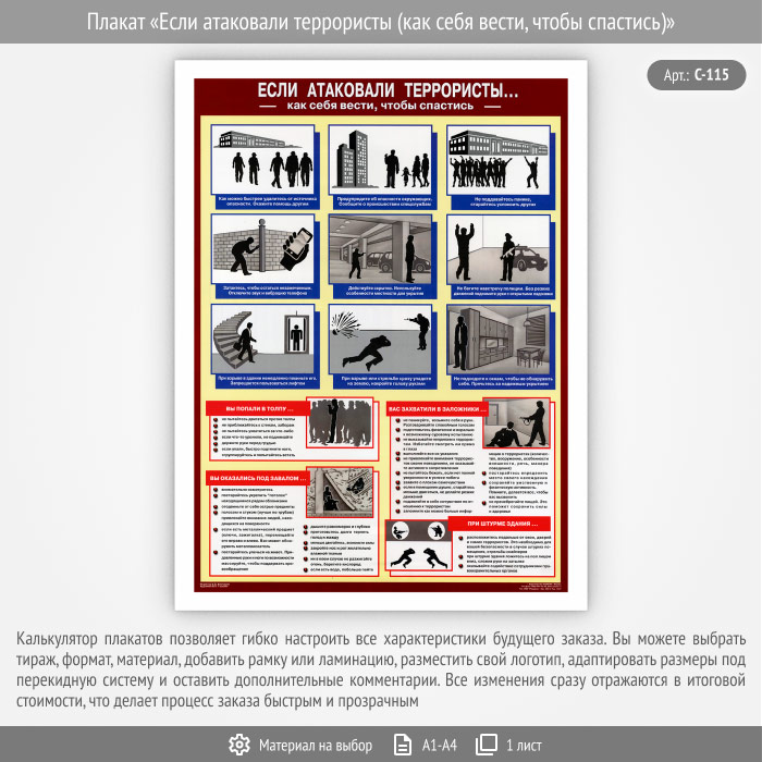 Плакат «Если атаковали террористы (как себя вести, чтобы спастись)» (С-115, 1 лист)