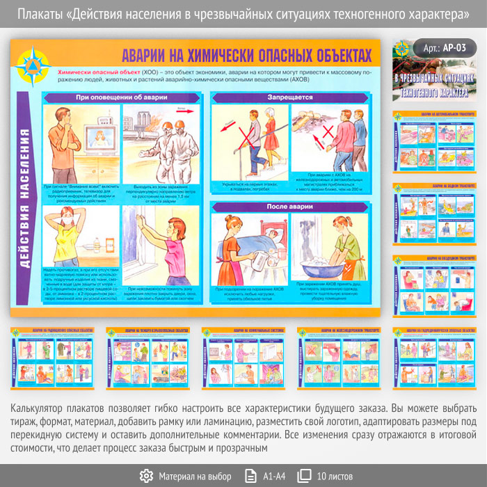 Плакаты «Действия населения в чрезвычайных ситуациях техногенного характера» (АР-03, 10 листов)