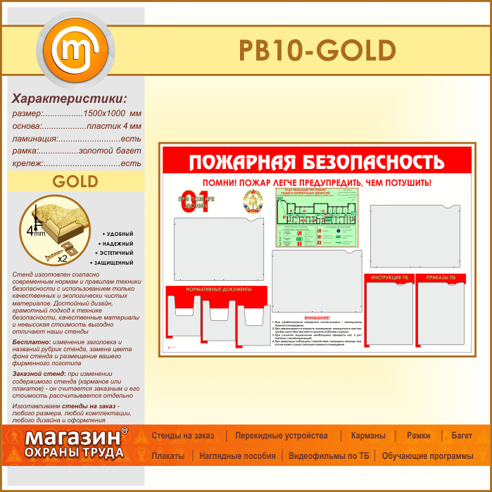 Стенд «Пожарная безопасность» с планом эвакуации, 5 плоскими и 3 объемными карманами (PB-10-GOLD) в Пушкино купить