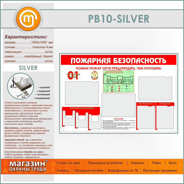 Стенд «Пожарная безопасность» с планом эвакуации, 5 плоскими и 3 объемными карманами (PB-10-SILVER) в Пушкино купить