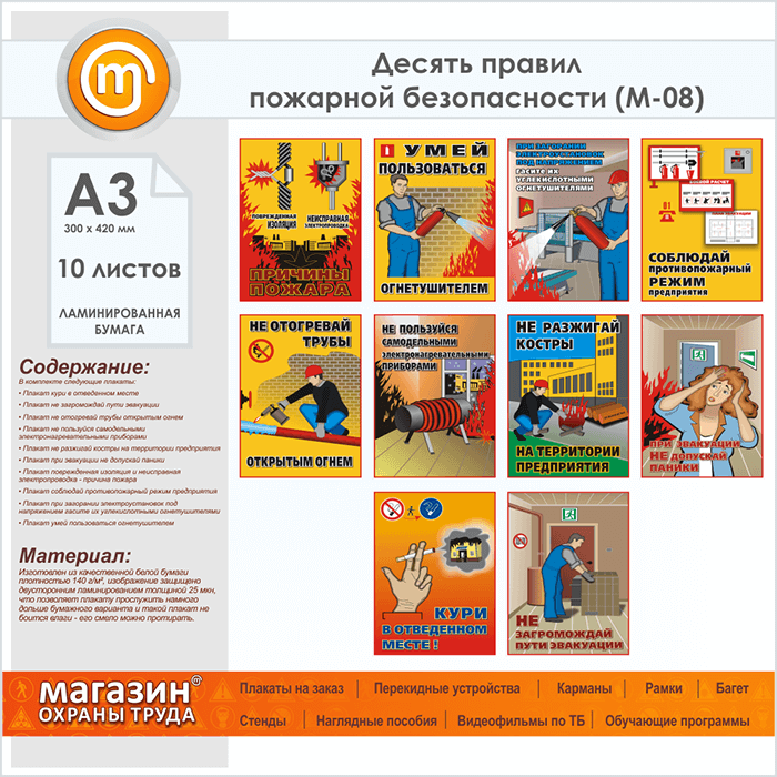 Плакаты «Десять правил пожарной безопасности» (М-08, ламинированная бумага, А3, 10 листов) в Пушкино купить