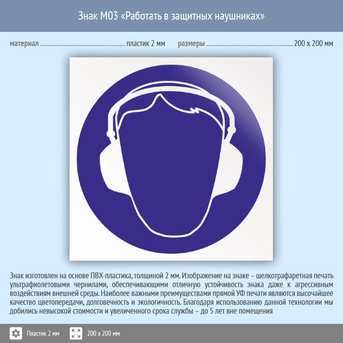 Знак M03 «Работать в защитных наушниках» (пластик, 200х200 мм) в Пушкино купить