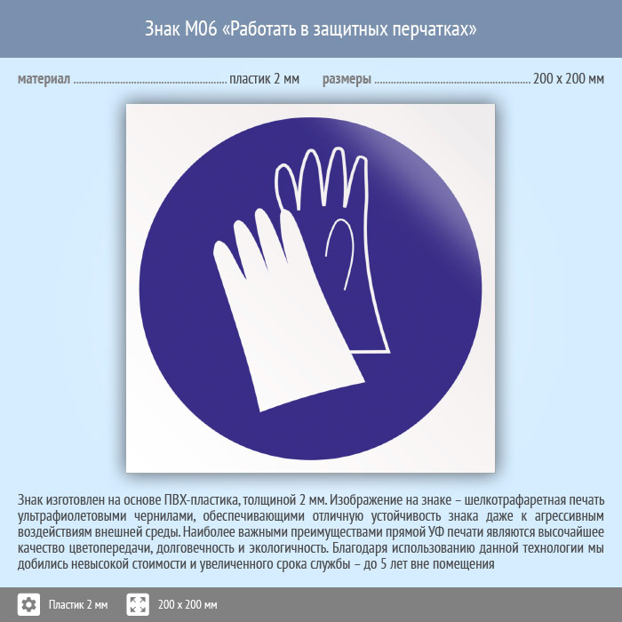Знак M06 «Работать в защитных перчатках» (пластик, 200х200 мм) в Пушкино купить
