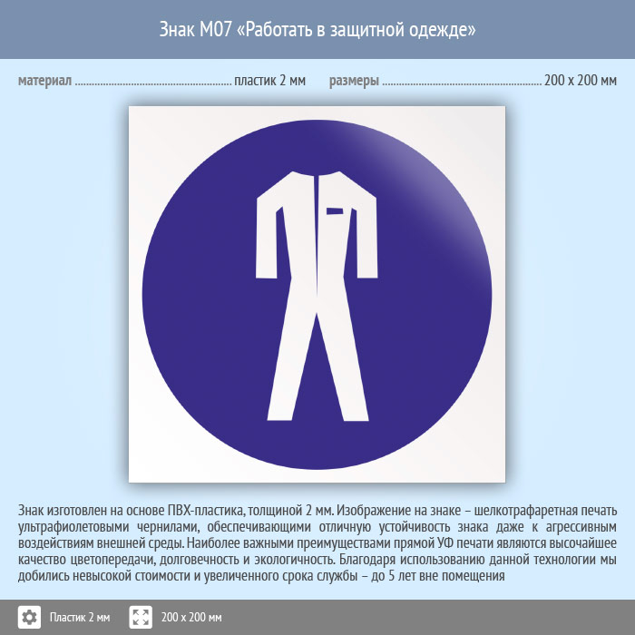 Знак M07 «Работать в защитной одежде» (пластик, 200х200 мм) в Пушкино купить