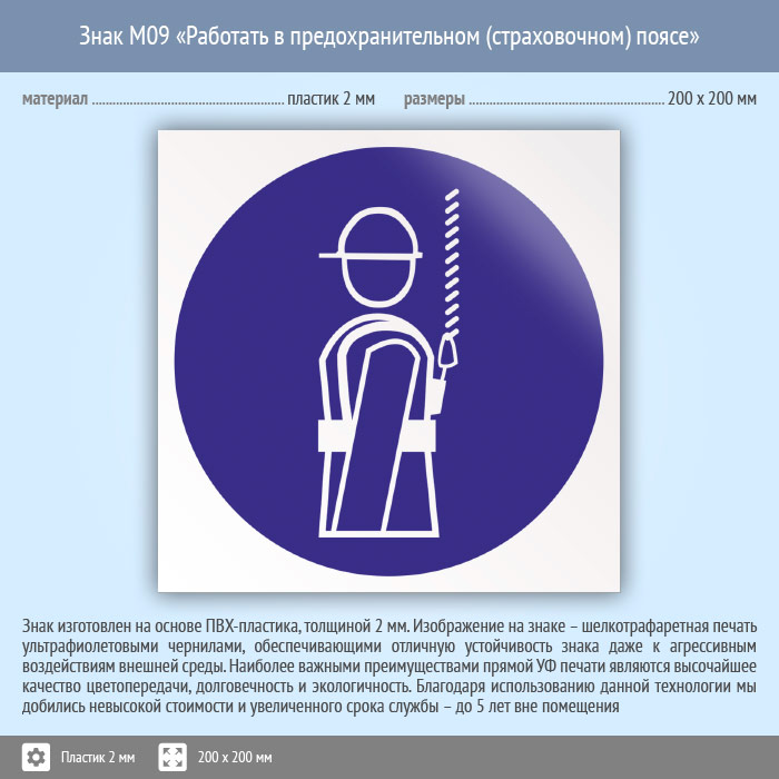 Знак M09 «Работать в предохранительном (страховочном) поясе» (пластик, 200х200 мм) в Пушкино купить