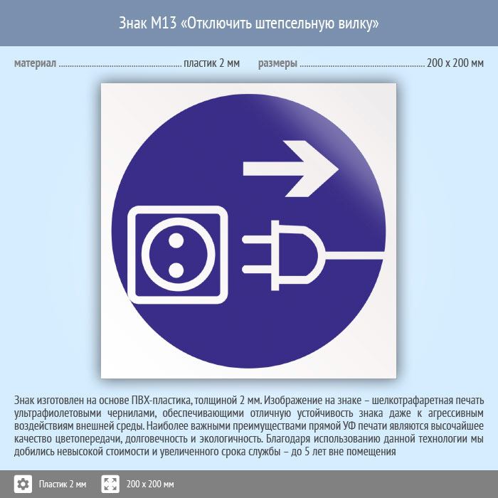 Знак M13 «Отключить штепсельную вилку» (пластик, 200х200 мм) в Пушкино купить