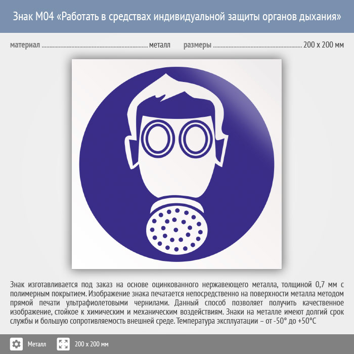 Знак M04 «Работать в средствах индивидуальной защиты органов дыхания» (металл, 200х200 мм) в Пушкино купить