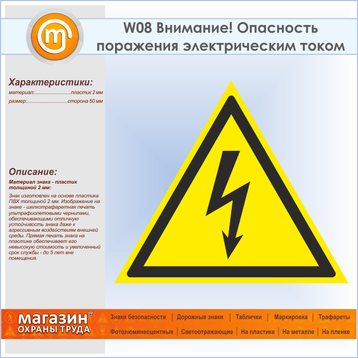 Знак W08 «Внимание! опасность поражения электрическим током» (пластик, сторона 50 мм) в Пушкино купить