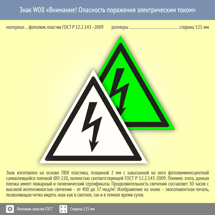 Знак W08 «Внимание! Опасность поражения электрическим током» (фотолюминесцентный пластик ГОСТ 34428-2018, сторона 125 мм) в Пушкино купить