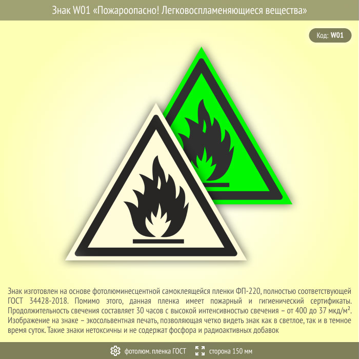Знак W01 «Пожароопасно! легковоспламеняющиеся вещества» (фотолюминесцентная пленка ГОСТ 34428-2018, сторона 150 мм) в Пушкино купить