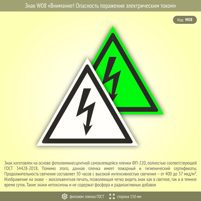 Знак W08 «Внимание! Опасность поражения электрическим током» (фотолюминесцентная пленка ГОСТ 34428-2018, сторона 150 мм) в Пушкино купить